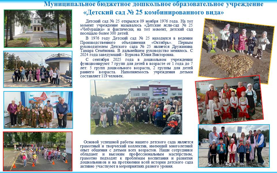 В 1976 году Детский сад № 25 находился в ведении Производственного объединения «Октябрь». Первым руководителем Детского сада № 25 является Дружинина Тамара Семёновна. Вместе с ней открывали детский сад и работали талантливые воспитатели: Ларионова Тамара Петровна, Суханова Мария Алексеевна, Тройнина Валентина Викторовна, Красноперова Надежда Степановна, одна из старейших воспитателей города – Ананьина Галина Константиновна. Галина Константиновна отличалась высоким профессионализмом, её выпускники всегда учились на «хорошо» и «отлично». На высоком уровне осуществляла подготовку детей к школе, знакомила с родным городом, воспитывала чувство любви и уважения. На её открытые занятия съезжался весь город.