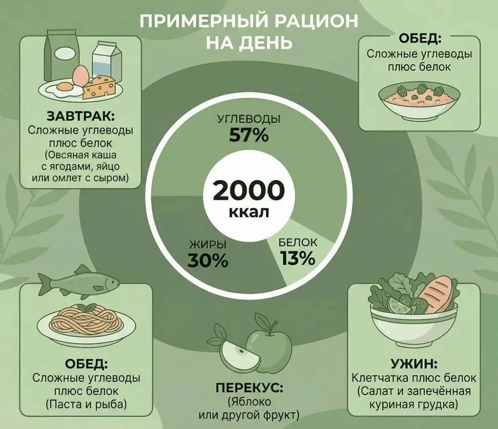 При составлении рациона, важна не только калорийность, но и то, как распределены белки, жиры и углеводы между этими калориями. Если представить весь калораж в виде 100%, то 45% должны составлять углеводы (предпочтительно медленные), 25% — жиры и 30% — белки.