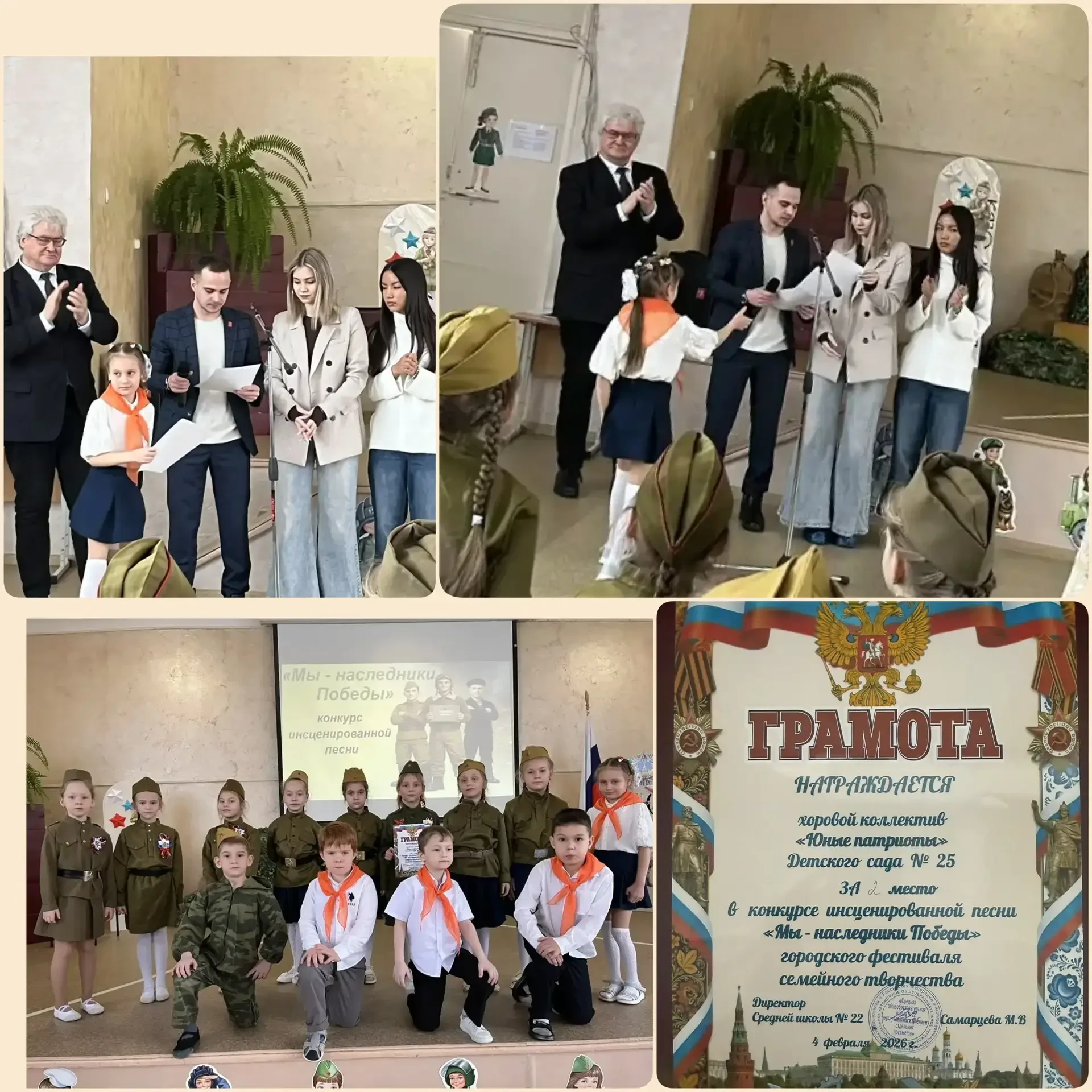 04.02.2026 года воспитанники подготовительных групп нашего детского сада приняли участие в городском конкурсе инсценированной песни «Мы — наследники Победы», который прошел в школе № 22.